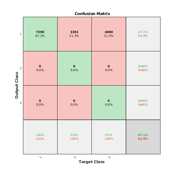 Диагональные ячейки показывают количество положений остатка, которые были правильно классифицированы для каждого структурного класса. Недиагональные ячейки показывают количество положений остатка, которые были неправильно классифицированы (например, спиральные положения, предсказанные как обмотанные положения). Диагональные ячейки соответствуют наблюдениям, которые правильно классифицируются. И количество наблюдений и процент общего количества наблюдений показывают в каждой ячейке. Столбец на ультраправом из графика показывает проценты всех примеров, предсказанных, чтобы принадлежать каждому классу, которые правильно и неправильно классифицируются. Эти метрики часто называются точностью (или положительное прогнозирующее значение) и ложный уровень открытия, соответственно. Строка в нижней части графика показывает проценты всех примеров, принадлежащих каждому классу, которые правильно и неправильно классифицируются. Эти метрики часто называются отзывом (или истинный положительный уровень) и ложный отрицательный уровень, соответственно. Ячейка в правом нижнем из графика показывает общую точность.