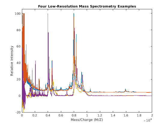 plot(MZ,Y) axis([0 20000 -20 105]) xlabel('Mass/Charge (M/Z)') ylabel('Relative Intensity') title('Four Low-Resolution Mass Spectrometry Examples')