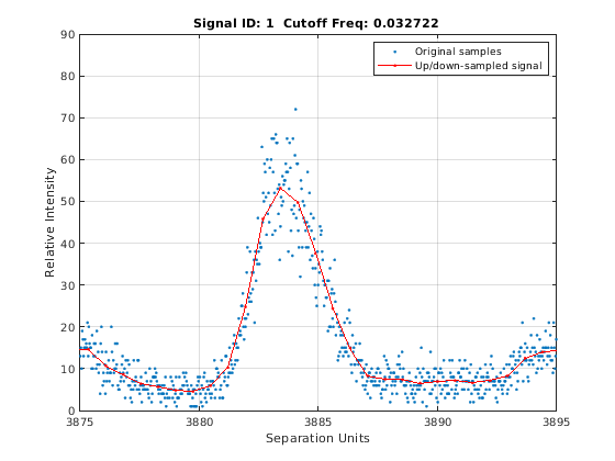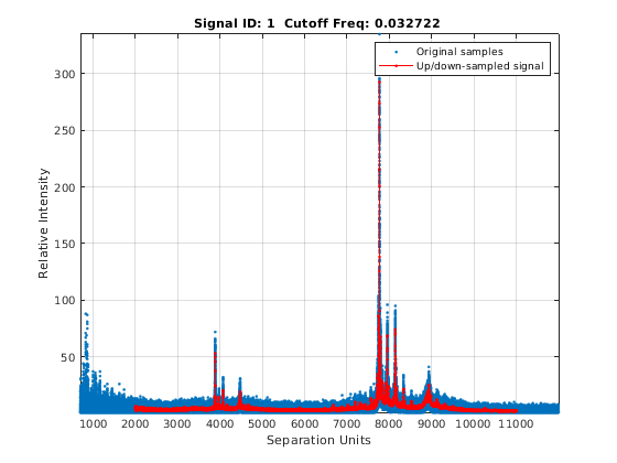 Передискретизация данных о масс-спектрометрии имеет несколько преимуществ. Это гомогенизирует массу/заряд (M/Z) вектор, позволяя вам сравнить различные спектры под той же ссылкой и в том же разрешении. В наборах данных с высоким разрешением большой размер файлов приводит к в вычислительном отношении интенсивным алгоритмам. Однако спектры с высоким разрешением могут быть избыточными. Путем передискретизации можно десятикратно уменьшить сигнал в более управляемый вектор M/Z, сохранив информационное содержимое спектров. msresample функция позволяет вам выбирать новый вектор M/Z и также применяет фильтр сглаживания, который препятствует тому, чтобы высокочастотный шум свернулся в более низкие частоты.