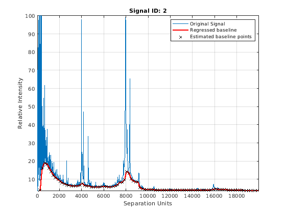 Данные о масс-спектрометрии обычно показывают различную базовую линию, вызванную химическим шумом в матрице или ионной перегрузкой. msbackadj функционируйте оценивает низкочастотную базовую линию, которая скрыта среди высокочастотного шума и peaks сигнала. Это затем вычитает базовую линию из спектрограммы.
