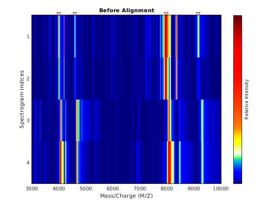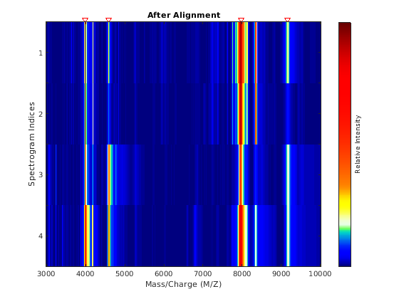 Чтобы выровнять спектрограммы, обеспечьте набор значений M/Z, где ссылочный peaks, как ожидают, появится. Можно также задать вектор с относительными весами, который используется выравнивающимся алгоритмом, чтобы подчеркнуть peaks с небольшой площадью.