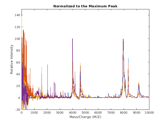 YN1 = msnorm(MZ,YA,'QUANTILE',1,'LIMITS',[1000 inf],'MAX',100); figure plot(MZ,YN1) axis([0 10000 -20 150]) xlabel('Mass/Charge (M/Z)') ylabel('Relative Intensity') title('Normalized to the Maximum Peak')