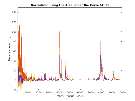 YN2 = msnorm(MZ,YA,'LIMITS',[1000 inf],'MAX',100); figure plot(MZ,YN2) axis([0 10000 -20 150]) xlabel('Mass/Charge (M/Z)') ylabel('Relative Intensity') title('Normalized Using the Area Under the Curve (AUC)')