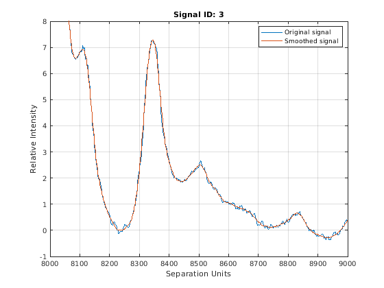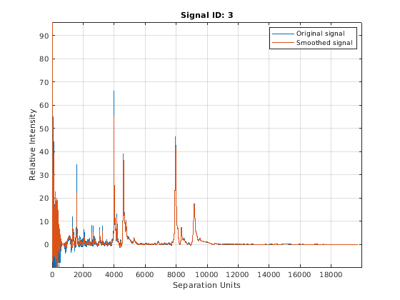 Стандартизированные спектры обычно содержат смесь шума и сигнала. Некоторые приложения требуют, чтобы шумоподавление спектрограмм улучшило валидность и точность наблюдаемых значений массы/заряда peaks в спектрах. По той же причине шумоподавление также улучшает дальнейшие пиковые алгоритмы обнаружения. Однако важно сохранить резкость (или высокочастотные компоненты) пика как можно больше. Для этого можно использовать сглаживание Lowess (mslowess) и полиномиальные фильтры (mssgolay).