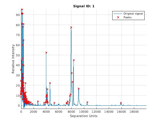 P1 = mspeaks(MZ,YS,'DENOISING',false,'HEIGHTFILTER',2,'SHOWPLOT',1)