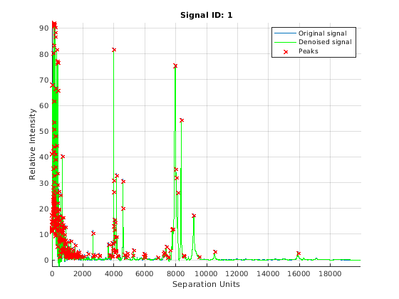 mspeaks функция может также оценить шум с помощью шумоподавления вейвлетов. Этот метод обычно более устойчив, потому что пиковое обнаружение может быть достигнуто непосредственно по шумным спектрам. Алгоритм адаптируется к различным шумовым условиям сигнала, и peaks может быть разрешен, даже если низкое разрешение или сверхсегментация существуют.