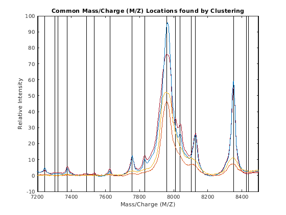 PR = accumarray(clusters,allPeaks(:,2),[],@max); [CMZ,h] = sort(CMZ); PR = PR(h); figure hold on box on plot([CMZ CMZ],[-10 100],'-k') plot(MZ,YN2) axis([7200 8500 -10 100]) xlabel('Mass/Charge (M/Z)') ylabel('Relative Intensity') title('Common Mass/Charge (M/Z) Locations found by Clustering')