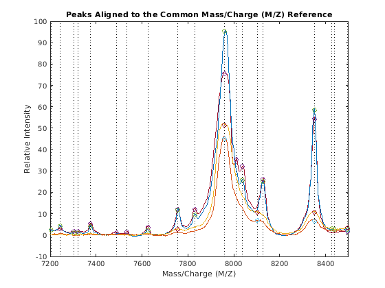 PA = nan(numel(CMZ),4); for i = 1:4 [j,k] = samplealign([CMZ PR],P3{i},'BAND',15,'WEIGHTS',[1 .1]); PA(j,i) = P3{i}(k,2); end figure hold on box on plot([CMZ CMZ],[-10 100],':k') plot(MZ,YN2) plot(CMZ,PA,'o') axis([7200 8500 -10 100]) xlabel('Mass/Charge (M/Z)') ylabel('Relative Intensity') title('Peaks Aligned to the Common Mass/Charge (M/Z) Reference')