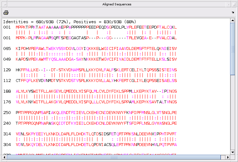[sc,hvc] = nwalign(human,chicken); showalignment(hvc)