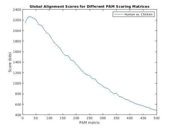 x = 10:10:500; plot(x,score) legend('Human vs. Chicken'); title('Global Alignment Scores for Different PAM Scoring Matrices'); xlabel('PAM matrix');ylabel('Score (bits)');