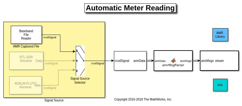 Этот пример показывает вам, как использовать Simulink® и Communications Toolbox™, чтобы считать служебные метры путем обработки сигналов Стандартного сообщения потребления (SCM) или Сообщения интервальных данных (IDM), испускаемых метрами. Можно использовать или зарегистрированные данные из файла или получить беспроводные сигналы в режиме реального времени с помощью Радио RTL-SDR или Радио ADALM-PLUTO.