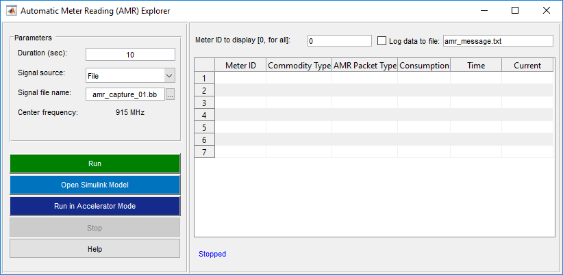 Можно далее исследовать сигналы AMR с помощью пользовательского интерфейса AMRSimulinkExampleApp. Это приложение позволяет вам выбирать источник сигнала и изменять центральную частоту радио RTL-SDR. Чтобы запустить приложение, введите AMRSimulinkExampleApp в Окне Команды MATLAB или щелкните по ссылке. Этот пользовательский интерфейс показывают в следующем рисунке.
