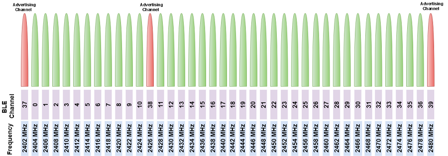 BLE классифицирует эти сорок каналов РФ в три рекламных канала (индексы канала: 37, 38, 39) и тридцать семь каналов данных (индексы канала: от 0 до 36). Обратите внимание на то, что рекламные каналы распространены через спектр на 2,4 ГГц. Цель этого широкого интервала состоит в том, чтобы избежать интерференции от других устройств, действующих в том же спектре, таких как WLAN. Каналы рекламы в основном используются в передаче рекламных пакетов, сканируют пакеты запроса/ответа и пакеты индикации связи. Каналы данных в основном используются в обмене пакетами данных.
