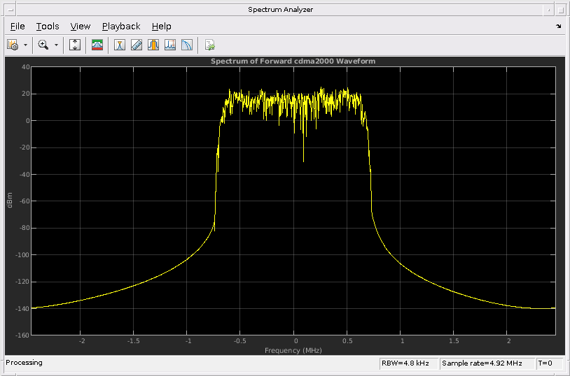 chiprate = 1.2288e6; % Chip rate of the baseband waveform (SR1) fSpectrumPlot = dsp.SpectrumAnalyzer('SampleRate', chiprate*fManualConfig.OversamplingRatio); fSpectrumPlot.Title = 'Spectrum of Forward cdma2000 Waveform'; fSpectrumPlot.YLimits = [-160,40]; fSpectrumPlot(forwardManualWaveform);