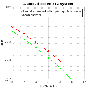 Обратите внимание на то, что с 8 экспериментальными символами для каждого 100 символов данных, оценка канала вызывает приблизительно ухудшение на 1 дБ в производительности для выбранной области значений Eb/No. Это улучшается с увеличением количества экспериментальных символов на систему координат, но добавляет к издержкам ссылки. В этом сравнении мы сохраняем переданный ОСШ на символ, чтобы быть тем же самым в обоих случаях.