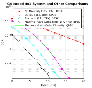 Мы ожидаем, что система предложит порядок разнообразия 4, и сравним ее с 1x4 и 2x2 системы, которые имеют тот же порядок разнообразия также. Чтобы допускать справедливое сравнение, мы используем четверичный PSK с полууровнем код G4, чтобы достигнуть той же скорости передачи 1 бита/секунды/Гц.