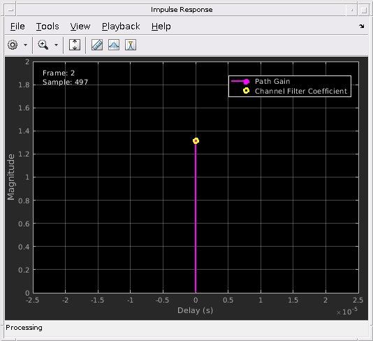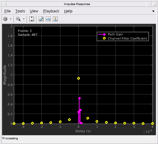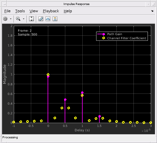 Установка Visualization свойство к 'Impulse response' показывает bandlimited импульсную характеристику (желтые круги). Визуализация также показывает задержки и величины базовых исчезающих усилений пути (розовый stembars) кластеризируемый вокруг пика импульсной характеристики. Обратите внимание на то, что усиления пути не равняются AveragePathGains значение свойства, потому что эффект Доплера заставляет усиления колебаться в зависимости от времени.