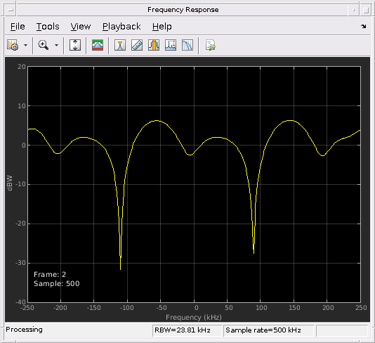 release(rayChan); rayChan.Visualization = 'Impulse and frequency responses'; rayChan.SampleRate = sampleRate20kHz; rayChan.SamplesToDisplay = '25%'; % Display one of every four samples numFrames = 2; for i = 1:numFrames % Display impulse and frequency responses for 2 frames msg = randi([0 1],bitsPerFrame,1); modSignal = qpskMod(msg); rayChan(modSignal); end