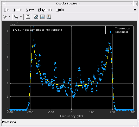 Для той же спецификации канала мы теперь отображаем Доплеровский спектр для его первого дискретного пути, который является статистической характеристикой процесса исчезновения. Системный объект делает периодические измерения Доплеровского спектра (голубые звезды). В зависимости от времени с большим количеством выборок, обработанных Системным объектом, среднее значение этого измерения лучше аппроксимирует теоретический Доплеровский спектр (желтая кривая).