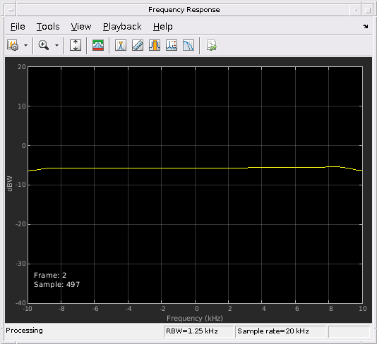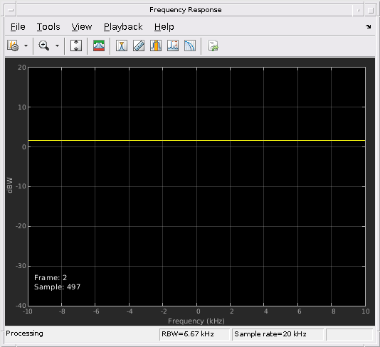Точно так же установка Visualization свойство к 'Frequency response' показывает частотную характеристику (преобразование ДПФ) импульсов. Можно также установить Visualization к 'Impulse and frequency responses' отобразить и импульсные и частотные характеристики рядом друг с другом..