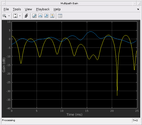 Рикиэн, исчезающий распространение угла обзора Моделей системных объектов канала, кроме того, чтобы рассеять многопутевое рассеивание. Это приводит к меньшему изменению величины усилений пути. Чтобы сравнить изменение между каналами Рейли и Рикиэна, мы используем Системный объект, чтобы просматривать их усиления пути в зависимости от времени. Обратите внимание на то, что величина колеблется приблизительно область значений на 10 дБ для Rician, исчезающего канал (синяя кривая), по сравнению с 30-40 дБ для Канала с релеевским замиранием (желтая кривая). Для Rician, исчезающего канал, это изменение далее уменьшалось бы путем увеличения K-фактора (в настоящее время набор к 10).dsp.TimeScope