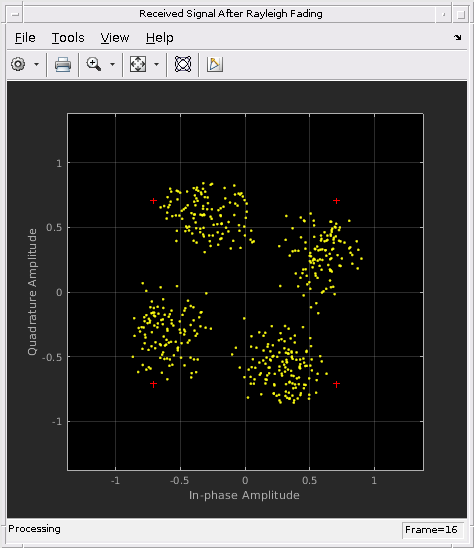 clear hRicChan hMultipathGain; release(rayChan); rayChan.PathDelays = delayVector; rayChan.AveragePathGains = gainVector; rayChan.MaximumDopplerShift = 5; % Configure a Constellation Diagram System object to show received signal constDiag = comm.ConstellationDiagram( ... 'Name', 'Received Signal After Rayleigh Fading'); numFrames = 16; for n = 1:numFrames msg = randi([0 1],bitsPerFrame,1); modSignal = qpskMod(msg); rayChanOut = rayChan(modSignal); % Display constellation diagram for Rayleigh channel output constDiag(rayChanOut); end