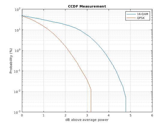 H = comm.CCDF создает дополнительное измерение кумулятивной функции распределения (CCDF) Системный объект, H, это измеряет вероятность мгновенной степени сигнала быть заданным уровнем выше его средней степени.
