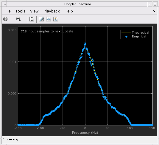 mimoChan = comm.MIMOChannel('SampleRate',1000, ... 'PathDelays',[0 0.002], ... 'AveragePathGains',[0 -3], ... 'MaximumDopplerShift',100, ... 'DopplerSpectrum',dp, ... 'Visualization','Doppler spectrum', ... 'PathsForDopplerDisplay',1);