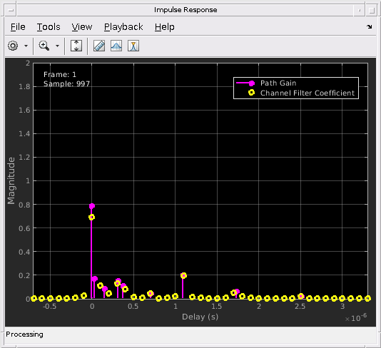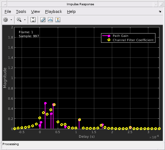 mimoChan = comm.MIMOChannel('SampleRate',fs, ... 'PathDelays',pathDelays, ... 'AveragePathGains',avgPathGains, ... 'MaximumDopplerShift',fD, ... 'Visualization','Impulse and frequency responses');