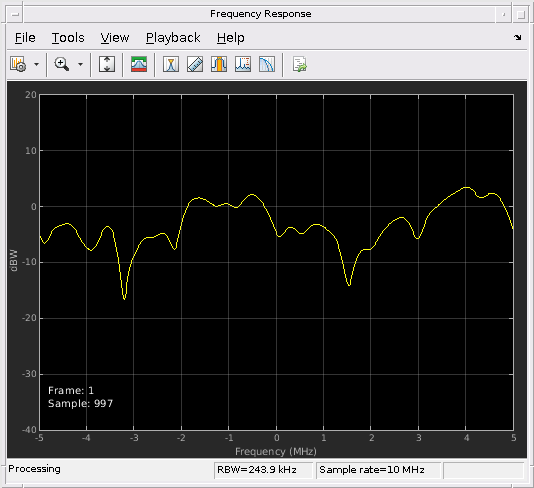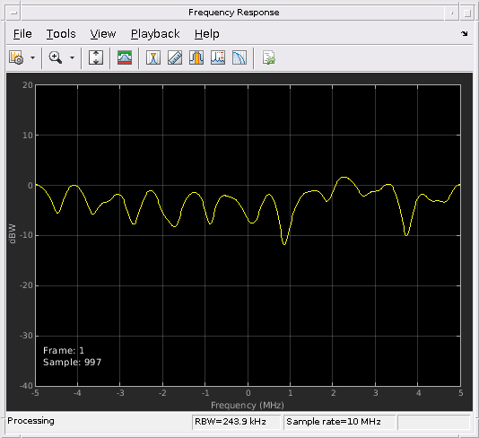Выпустите mimoChan и набор PathsForDopplerDisplay свойство к 2. Необходимо выпустить объект, когда свойство является ненастраиваемым. Вызовите функцию многократно, чтобы отобразить Доплеровский спектр второго пути. Заметьте, что спектр является плоским.