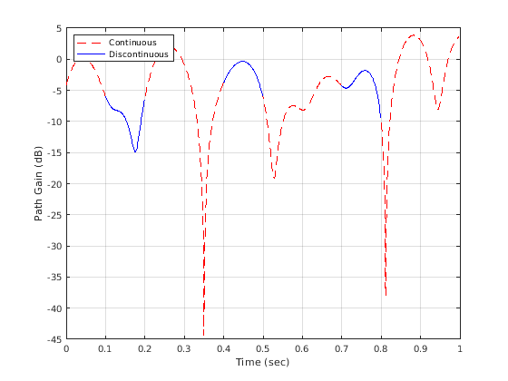 plot(t0,pathGain0,'r--') hold on plot(t1,pathGain1,'b') plot(t2,pathGain2,'b') plot(t3,pathGain3,'b') grid xlabel('Time (sec)') ylabel('Path Gain (dB)') legend('Continuous','Discontinuous','location','nw')