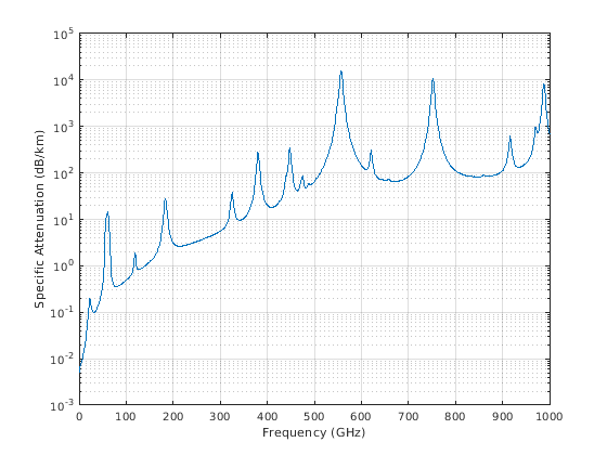 loss = gaspl(km,freqs,T,Patm,rho_wv); semilogy(freqs/1e9,loss) grid on xlabel('Frequency (GHz)') ylabel('Specific Attenuation (dB/km)')