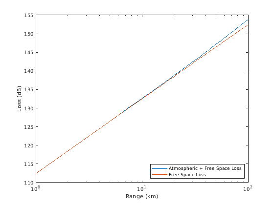 ranges = [1:100]*1000; freq_xband = 10e9; loss_gas = gaspl(ranges,freq_xband,T,Patm,rho_wv); lambda = c/freq_xband; loss_fsp = fspl(ranges,lambda); semilogx(ranges/1000,loss_gas + loss_fsp.',ranges/1000,loss_fsp) legend('Atmospheric + Free Space Loss','Free Space Loss','Location','SouthEast') xlabel('Range (km)') ylabel('Loss (dB)')