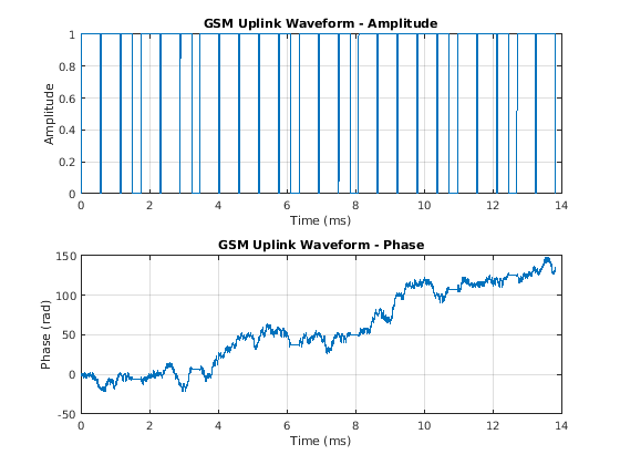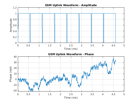 [x,t] = createUplinkWaveform(3); figure subplot(2,1,1); plot(t,abs(x)); grid on; title('GSM Uplink Waveform - Amplitude'); xlabel('Time (ms)'); ylabel('Amplitude') subplot(2,1,2); plot(t,unwrap(angle(x))); grid on; title('GSM Uplink Waveform - Phase'); xlabel('Time (ms)'); ylabel('Phase (rad)')