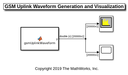 Блок MATLAB function содержит gsmUplinkWaveform функциональный код. Код в блоке MATLAB function создает форму волны GSM при помощи gsmUplinkConfig возразите и gsmFrame функция.