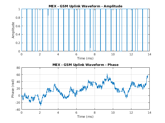 [x,t] = createUplinkWaveform_mex(3); figure subplot(2,1,1); plot(t,abs(x)); grid on; title('MEX - GSM Uplink Waveform - Amplitude'); xlabel('Time (ms)'); ylabel('Amplitude') subplot(2,1,2); plot(t,unwrap(angle(x))); grid on; title('MEX - GSM Uplink Waveform - Phase'); xlabel('Time (ms)'); ylabel('Phase (rad)')