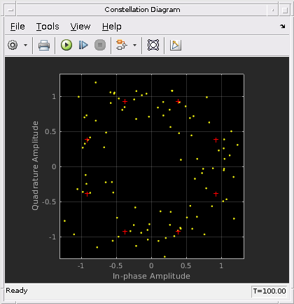 Блок M-PSK Modulator Baseband предусматривает возможность визуализировать сигнальное созвездие из маски блока. Нажатие кнопки View Constellation позволяет вам визуализировать сигнальное созвездие для заданных параметров блоков.