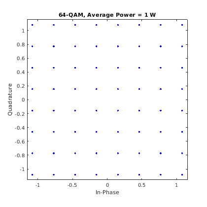 Модулируйте случайные символы данных с помощью QAM. Нормируйте модулятор выход так, чтобы это имело среднюю силу сигнала 1 Вт.