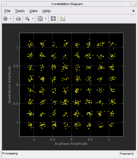 Модулируйте последовательность битов, использующих 64-QAM. Передайте сигнал через шумный канал. Отобразите результирующую схему созвездия.