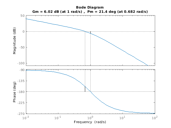 [ возвращает запас по амплитуде Gm,Pm,Wcg,Wcp] = margin(sys)Gm в абсолютных единицах, запас по фазе Pm, и соответствующие частоты Wcg и Wcp, из sys. Wcg частота, где запас по амплитуде измеряется, который является частотой пересечения фазы на-180 °. Wcp частота, где запас по фазе измеряется, который является частотой пересечения 0 усилений дБ. Эти частоты выражаются в radians/TimeUnit, где TimeUnit модуль, заданный в TimeUnit свойство sys. Когда sys имеет несколько перекрестных соединений, margin возвращает самые маленькие запасы по амплитуде и фазе и соответствующие частоты.