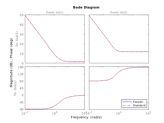Чтобы создать или преобразовать в контроллер параллельной формы, используйте pid2. Параллельная форма выражает действия контроллера в терминах пропорционального, интеграла, и производная получает Kp, Ki и Kd и постоянную времени фильтра Tf. Например, отношением между входными параметрами и выходом параллельной формы непрерывного времени ПИД-регулятор 2-DOF дают: