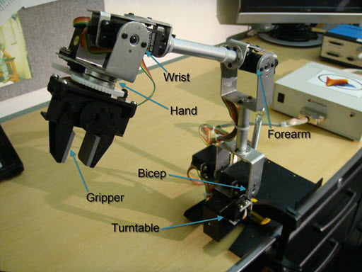Этот пример использует шесть роботизированных рук степени свободы, показанных ниже. Эта рука состоит из шести соединений, помеченных от основы, чтобы снабдить подсказкой: "Проигрыватель", "Bicep", "Предплечье", "Запястье", "Рука" и "Механизм захвата". Каждое соединение приводится в движение двигателем постоянного тока за исключением соединения Bicep, которое использует два двигателя постоянного тока в тандеме.