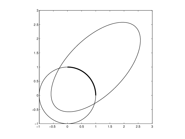 ellipse = fncmb(circle,[2 0;0 1]); s45 = 1/sqrt(2); rtellipse = fncmb(fncmb(ellipse, [s45 -s45;s45 s45]), [1;1] ); hold on, fnplt(rtellipse), hold off