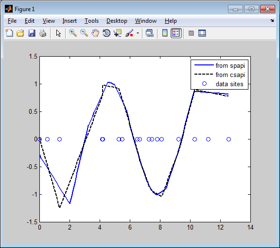 предоставляет кубического Эрмита interpolant синусоидальной функции, а именно, кусочная кубическая функция, с пропусками во всем x(i)это совпадает с синусоидальной функцией в значении и наклоне во всем x(i). Это делает interpolant непрерывное с непрерывной первой производной, но в целом она имеет скачки через перерывы в ее второй производной. Как эта команда знает который часть массива значения данных [y cos(x)] предоставляет значения и который наклоны? Заметьте, что массив сайта данных здесь дан как [x x], т.е. каждый сайт данных появляется дважды. Также заметьте тот y(i) сопоставлен с первым вхождением x(i), и cos(x(i)) сопоставлен со вторым вхождением x(i). Значение данных, сопоставленное с первым выступлением сайта данных, взято, чтобы быть значением функции; значение данных, сопоставленное со вторым внешним видом, взято, чтобы быть наклоном. Если бы был третий внешний вид того сайта данных, соответствующее значение данных было бы взято в качестве второго производного значения, которое будет соответствующим на том сайте. Смотрите Построение и Работу со Сплайнами B-формы для обсуждения команды augknt используемый здесь, чтобы сгенерировать соответствующую "последовательность узла".