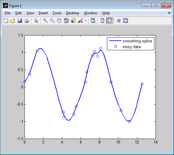 Время от времени вы можете предпочесть просто получать самый сглаженный кубический сплайн sp это - в заданном допуске tol из определенных данных в том смысле, что norm(noisy - fnval(sp,x))^2 <= tol. Вы создаете этот сплайн с командой sp = spaps(x,noisy,tol) для вашего заданного допуска tol.