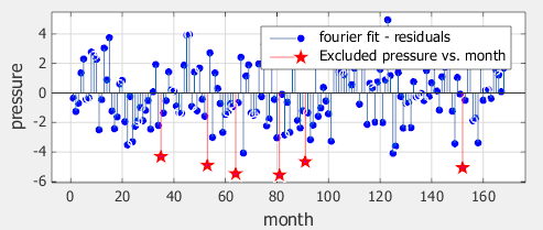 На графике остаточных значений можно просмотреть ошибки между подгонкой и данными, и можно удалить выбросы. Смотрите Удаляют Выбросы. Этот пример показывает график остаточных значений с некоторыми исключенными выбросами.