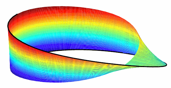 Вот пример поверхности, созданной как двумерный сплайн с 3-D знаком. Поверхность является известной группой Мёбиуса, доступной путем взятия длинноватой полосы бумаги и склеивания ее узких концов, но со скручиванием. Фигура получена следующими командами:
