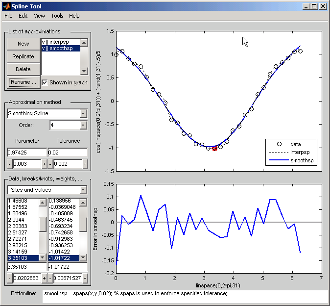 Варьируйтесь Допуск между 0 и некоторое большое значение, даже inf. Приближение изменяется от самого лучшего, “естественный” кубический сплайн interpolant, к наименьшим квадратам прямолинейное приближение.