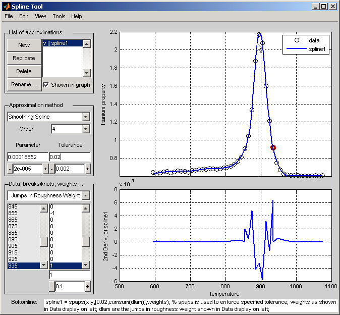 Установите скачок через выбранный сайт к 1. Поскольку вес шероховатости только слева от подсвеченного сайта 0, вы только что установили вес шероховатости справа от подсвеченного сайта к 1. Соответственно, вторая производная стала относительно маленькой справа от того сайта. Общий эффект очень является гладким, но не очень точная подгонка далеко от пика, в то время как в пиковой области, подгонка сплайна намного лучше, но вторая производная намного больше, как показан во вспомогательном графике ниже.
