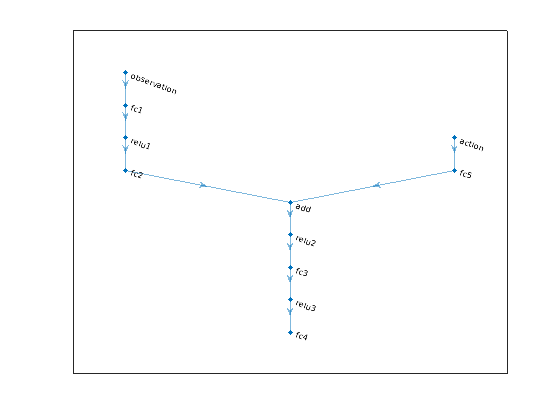 L = 48; % number of neurons statePath = [ imageInputLayer([3 1 1],'Normalization','none','Name','observation') fullyConnectedLayer(L,'Name','fc1') reluLayer('Name','relu1') fullyConnectedLayer(L,'Name','fc2') additionLayer(2,'Name','add') reluLayer('Name','relu2') fullyConnectedLayer(L,'Name','fc3') reluLayer('Name','relu3') fullyConnectedLayer(1,'Name','fc4')]; actionPath = [ imageInputLayer([1 1 1],'Normalization','none','Name','action') fullyConnectedLayer(L, 'Name', 'fc5')]; criticNetwork = layerGraph(statePath); criticNetwork = addLayers(criticNetwork, actionPath); criticNetwork = connectLayers(criticNetwork,'fc5','add/in2');